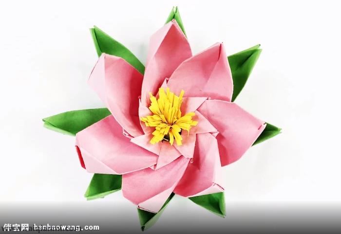 将粉色正方形折纸折成四等分,小角全部折叠成三角形,沿开口打开后,折叠成花瓣的形状,将七片花瓣组合成莲花灯,然后用绿色的正方形折纸折成六等分,同样的方法折出八片叶子,最后用黄色折纸卷出花蕊,折纸莲花灯就完成了。