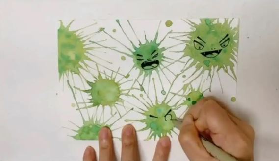 然后用吸管慢慢吹开,延伸出细线。通过控制自己的呼吸从而控制颜料的走向。