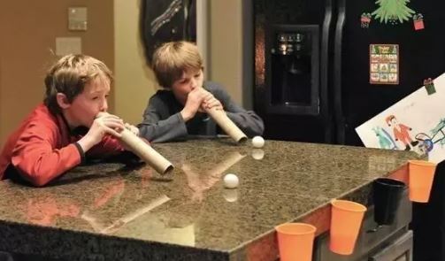 或者这样玩,把纸杯贴在桌子边,孩子从另一边吹球进洞,看谁的速度快